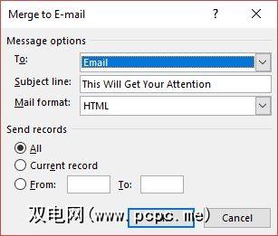 合并到电子邮件对话框打开。单击确定。