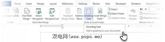功能区上的“邮件"选项卡位于正面和中央。在这里,您将要使用个性化的问候语开始您的群发电子邮件。在Microsoft Word的邮件标签中,选择问候语行。