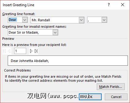 请注意,合并字段来自邮件列表中的列标题。因此,如果不匹配,请使用匹配字段来确保合并保持准确。如果您要的字段显示“不匹配",请选择该字段的下拉列表,然后选择与列表中该列匹配的列名。