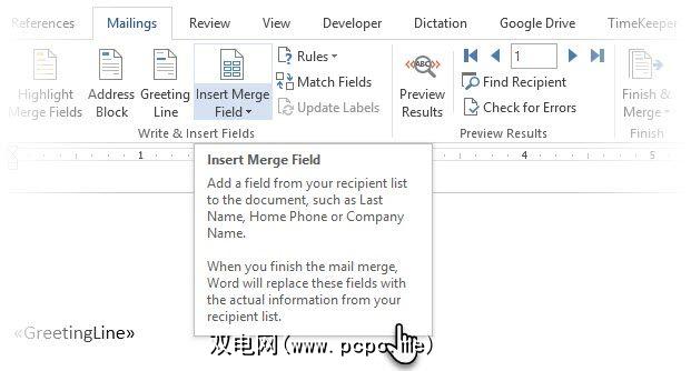 点击插入合并字段。 此数据必须存在于您的原始数据源中,在这种情况下,即Microsoft Outlook中的“联系人"信息。示例包括–家庭地址,家庭电话,职务等。单击小下拉箭头时,您可以看到完整的列表。