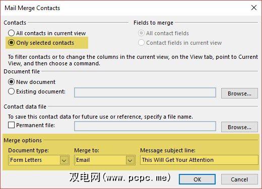 3。如果您的个性化电子邮件是针对特定批次的联系人的,则在您现在应该看到的``邮件合并联系人''屏幕中,选择仅所选联系人。在下面的“合并选项"部分下,选择以下参数。