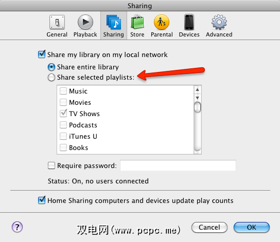 下一步,在iTunes中,打开首选项>共享并启用“ 本地网络上的家庭共享"。如果您拥有庞大的iTunes库,则可能要限制共享的内容,以便可以在远程设备上更快地访问它。您还可以要求输入密码来保护您的连接。如果您的iTunes在另一台Mac或Windows PC上运行,则也可以将库共享给这些计算机。