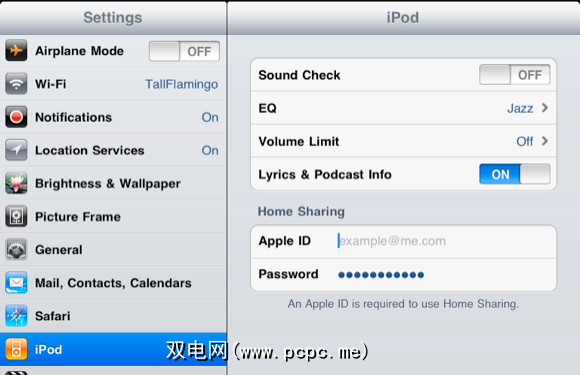 在iOS 4.3设备上,打开“设置"应用,然后在其中选择 iPod 设置列。从那里,您将需要提供Apple ID和密码以在设备上激活家庭共享。