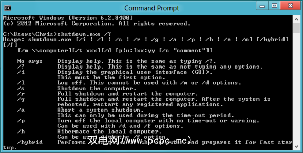 您可以在“命令提示符"窗口中运行 shutdown.exe /?命令以查看可用于执行开关的完整列表自定义您的“关闭"快捷方式。
