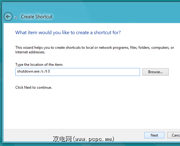 要创建新的快捷方式,请右键单击桌面,指向 New ,然后选择< em>快捷方式。将以下行复制并粘贴到位置框中,以创建可立即关闭计算机的快捷方式: