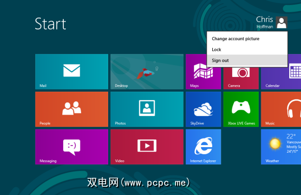 您可以在退出后从登录屏幕关闭Windows 8。要退出,请打开开始屏幕(按Windows键或将鼠标移到屏幕的左下角并单击),单击您的姓名,然后选择退出 >。