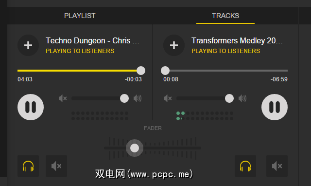 “ Spreaker Studio记录"窗口分为三个窗格,左右两个窗格都有两个视图。左侧是“播放列表",您可以在其中添加音频轨道以在录制过程中进行提示和播放。要调整文件之间的音量和淡入淡出,请切换到“轨道"视图。
