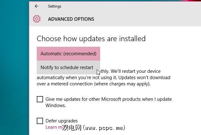 转到设置>更新和安全> Windows Update>高级选项。“选择更新的安装方式"选项设置为默认为自动(推荐)。从下拉菜单中将其更改为通知以计划重新启动。