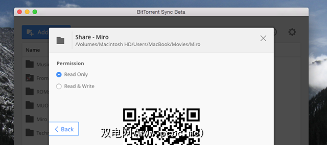 不用担心:它比现在更容易。继续下载适用于台式机的BitTorrent Sync。设置一个要同步的文件夹,然后单击“共享"按钮。您将看到QR码的选项: