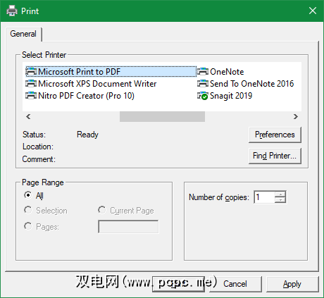 在Windows 10中,有一个内置选项可打印为PDF。只需转到文件>打印(或使用键盘快捷键 Ctrl + P )在您使用的应用中打开打印对话框。当您看到可用打印机列表时,选择 Microsoft Print to PDF 。