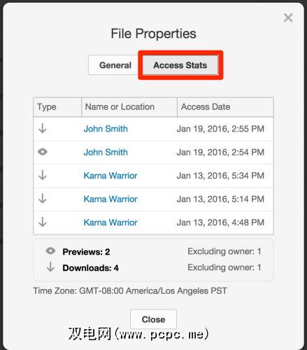 Box是唯一内置跟踪功能的服务,但确实需要付费升级到企业帐户。所有三个级别的企业帐户(每月5美元起)使用户可以访问他们共享的每个文件的下载统计信息。您还可以从计数中排除所有者的下载。