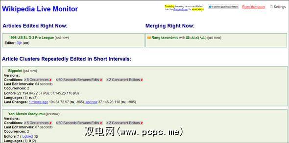 正如我之前提到的,突发新闻和Wikipedia编辑之间的相关性很快。 Wikipedia Live Monitor是一个不错的网络应用程序,旨在提醒所有关心Wikipedia漏洞的人。这通常可以说明网络上发生的问题。开源项目使用一组独特的算法来确定哪些编辑实际上符合突发新闻候选条件。它还对社交网络Twitter,Facebook和Google+进行跨语言全文社交网络搜索,以进行合理性检查。该项目与对该方法进行了更详细研究的研究论文相关。