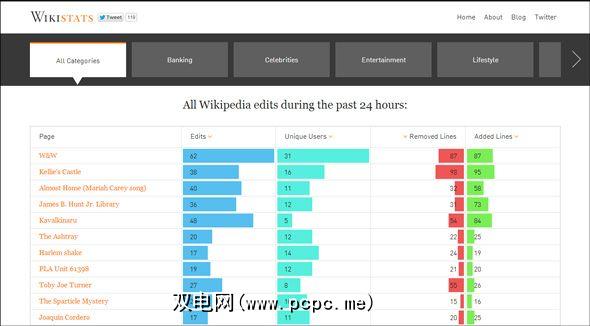 使人对信息有所了解: Wikipedia Stats页面将向您显示大量信息。每天发生的编辑量。要使这一切有意义,您必须借助跟踪工具和过滤器。