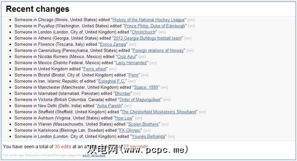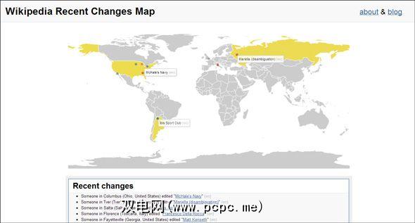 跟踪Wikipedia在世界地图上进行编辑。您可以在地图上关注更新,并在下面的文本框中详细了解更改。编辑来自未注册的Wikipedians,所以这只占网站实际更改的一小部分(仅15%)。尽管如此,它还是一个重要的可视化。该地图有助于表明编辑发生在全球的各个角落,并且在地理上可能与手头的主题无关。