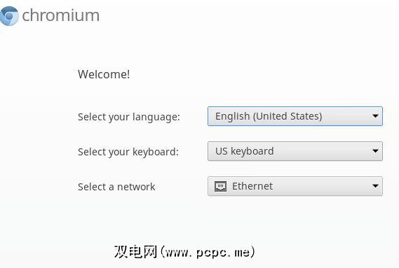 首次启动此版本的Chromium OS时,您会看到与您一样的欢迎屏幕正在启动具有新安装的操作系统版本的计算机。