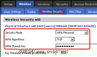 - Click on the Wireless Security tab in the second row of tabs, and configure the router to match the security settings as your main router. In my case, my main wireless router has WPA security mode with TKIP shared key, so I set up DD-WRT to match it.