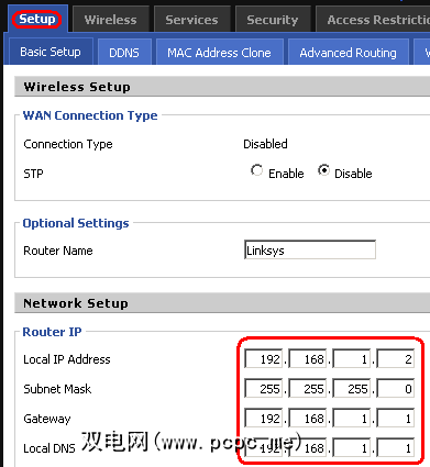 - 在与主路由器相同的子网上为路由器分配本地IP地址,但请给它一个不同的地址。这意味着该地址的所有数字将与主路由器相同,除了第四个框中的数字。例如,我的主路由器的地址为 192.168.1.1 ,因此我给DD-WRT路由器的IP地址为 192.168.1.2 。