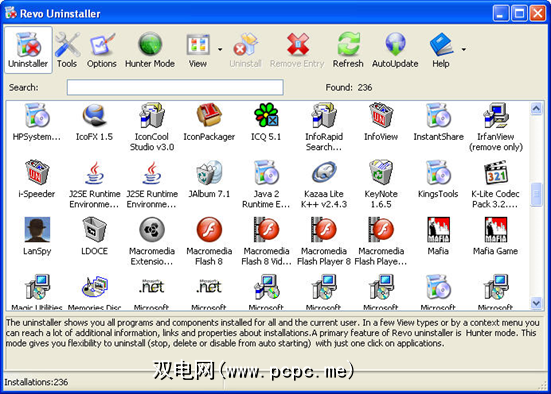 Revo Uninstaller特有的“〜Hunter Mode"使您能够选择要用鼠标删除的应用程序–如果该程序有用您尝试删除的文件没有出现在“添加/删除程序"列表中。