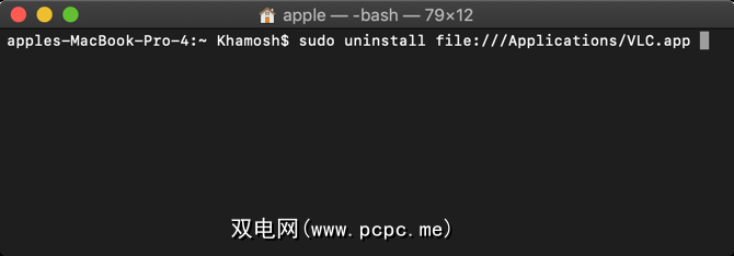 sudo uninstall file:///Applications/vlc.app按 Enter (在 Applications 之前,第三个斜杠是正常的),输入密码,终端会为您卸载该应用程序。