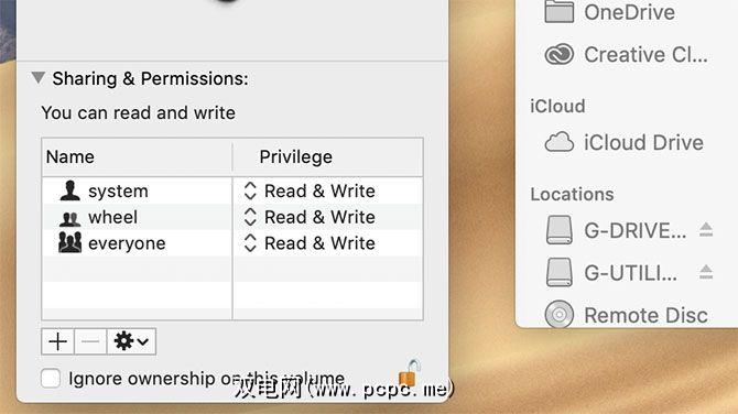 如果您想知道如何在Mac上锁定外部硬盘,大致类似于解锁。要将驱动器设为只读,请右键单击该驱动器,然后选择获取信息。在这里,取消选中窗口底部的忽略该卷的所有权(如果已被选中)。