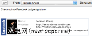 那有多容易?无需插件,其他软件或专家技能!对于我们也希望使用其Facebook个人资料作为电子邮件签名的非Mac朋友,我相信Saikat的帖子将教您一两个关于将HTML集成到Gmail中的知识。