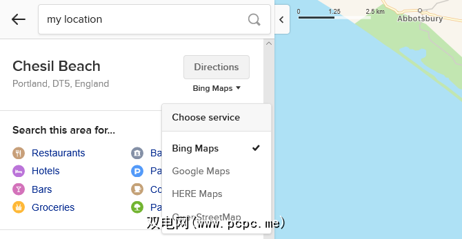 首先,没有内置的路线规划支持。界面中有一个方向按钮,但默认情况下,单击此按钮会将您带到Windows 10的Bing Maps中。您可以根据需要选择其他服务。在macOS上,您将转到Apple Maps应用程序,并在其他平台上将其发送到Google Maps。