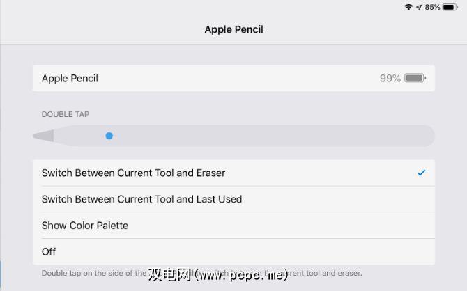 对于Apple的Notes应用,您可以在设置> Apple Pencil 中找到自定义选项。除了完全关闭手势之外,您还可以选择在当前工具和橡皮擦之间切换,在当前工具和最后使用的橡皮擦之间和显示调色板 strong>。
