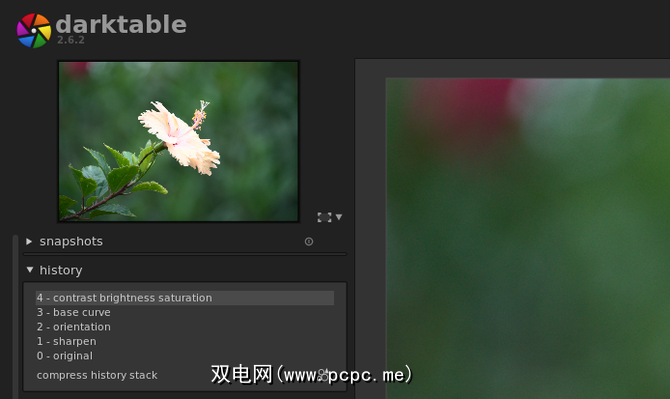 在左侧,您可以看到在当前图像上所做的更改的时间轴。当您单击历史记录部分时,您可能会惊讶地发现Darktable已经自动对图像进行了一些调整。您可以通过跳回原始设置来撤消它们。在工作时,您还可以选择手动创建自己的快照。