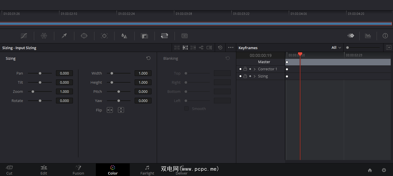 在曲线面板曾经所在的位置,您现在将看到用于调整大小的所有不同参数 -平移、倾斜、缩放、旋转、宽度、高度、俯仰、偏航,甚至两个翻转命令(消隐是 OpenFX 独有的;您'只有订阅了 DaVinci Resolve Studio 才能使用此功能)。