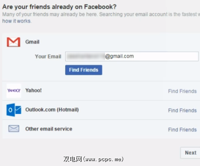 您会看到提示,要求您检查Gmail, Yahoo,Outlook或其他电子邮件帐户作为朋友的电子邮件地址。单击电子邮件地址下方的查找朋友按钮以获取建议,完成后单击下一步。