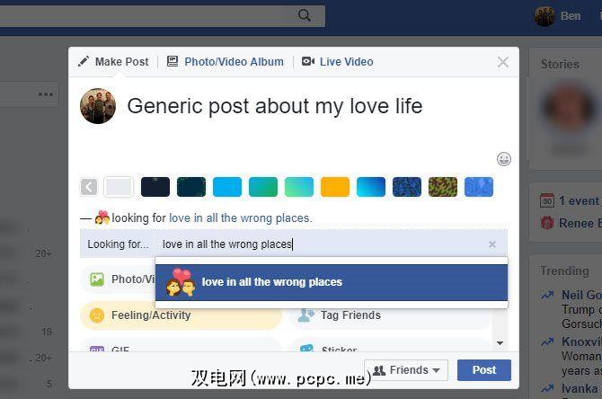 最基本的状态更新仅包括文字-只需输入您的想法,然后点击发布即可分享。如果需要更多技巧,可以使用文本框下方的怪异模式之一将帖子放置在背景上。不过,这仅适用于短篇文章。