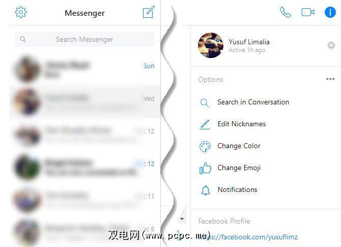 如果要全屏使用Messenger,请单击在Messenger中查看全部以打开完整的Messenger页面。单击左侧边栏上的联系人,或使用最近对话上方的搜索栏查找朋友。在右侧栏上,您可以更改当前聊天的设置,包括通知,颜色和昵称。