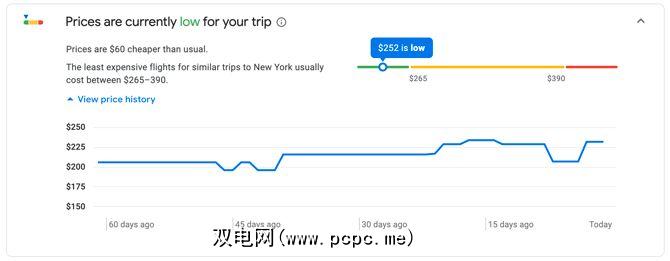 您将首先查看离港航班的结果,价格,停留时间和旅行时间。您还会看到一个漂亮的部分,向您显示旅行价格是否低廉,您可以点击查看价格历史记录以了解价格变化的详细信息。