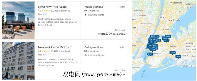 单击以选择一个选项,您将在Google.com上获得更多套餐信息。在这里您可以查看酒店的完整详细信息并找到合适的航班。
