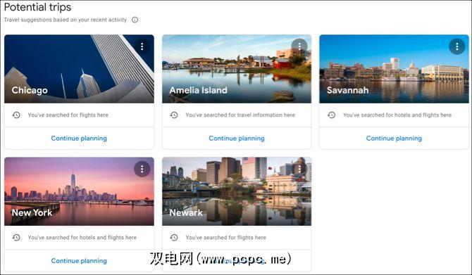 根据您在Google Flights上的活动,您会看到潜在行程,并可以选择继续计划其中的任何一个。如果您点击该 Continue Planning (继续计划)链接,则会获得您为该行查看或选择的选项的摘要。