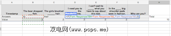 =IF('Form Responses'!B4='Form Responses'!B2,'Form Responses'!B3,0)这意味着,如果单元格不匹配,则分数为0。因此,如果学生跳过该问题,他们将收到