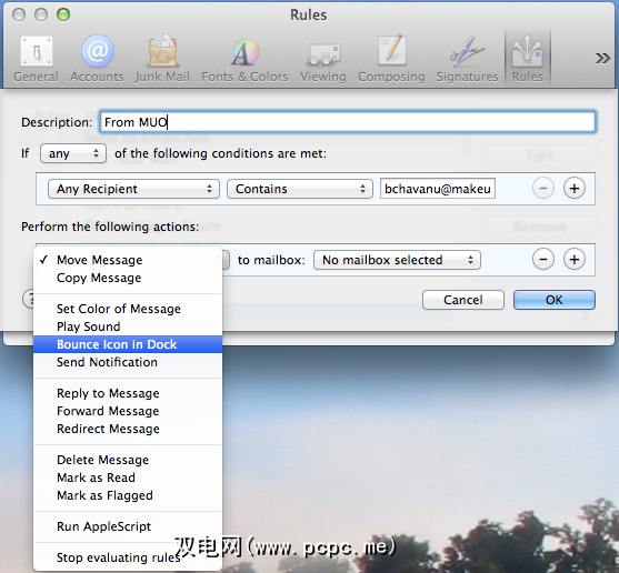 下一步,单击“ 移动消息"按钮,然后选择“ Dock中的弹跳图标。"单击确定,每当收到来自选定人员的电子邮件时,此规则就会激活。