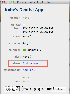 您可以与重要的其他人共享日历约会。假设您在“日历"应用中为您的孩子安排了牙医任命。您可以使用“ 添加受邀者…"功能与您的配偶共享日历日期。此功能将向被邀请人发送电子邮件,并附上日历日期。受邀者接受日历日期后,它将被添加到其支持的日历应用程序中。
