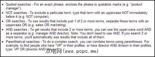 布尔搜索可让您优化搜索结果。在搜索特定结果帮助页面上,LinkedIn列出了一些有用的技术。