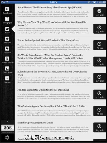 但是,我刚刚发现了一个非常有趣且实用的iPad应用,名为ReadQuick(3.99美元),它结合了一种有用的快速阅读技术,并可以连接到您的Instapaper和Pocket帐户。在使用Readquick应用程序的几天里,我快速阅读了几篇“稍后阅读"文章,同时还练习了一种良好的速读技术。