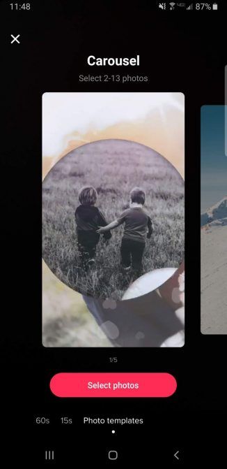 TikTok不仅允许您从图库中上传视频,而且还允许您上传一系列照片来创建幻灯片。单击屏幕底部的相同加号图标。您会看到有关视频时长的选项,以及显示照片模板的选项。滑动以选择模板,然后点击选择照片。