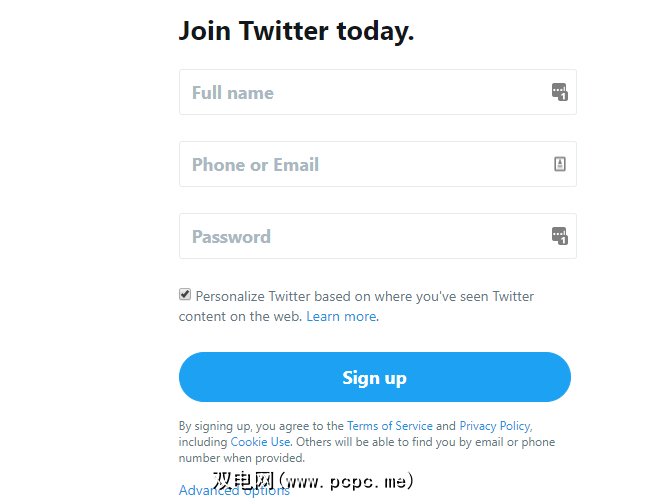 前往Twitter的注册页面开始使用。您需要提供姓名,电子邮件地址或电话号码以及密码。如果您不希望使用浏览习惯向您投放更多相关的广告,请取消选中个性化Twitter 框。