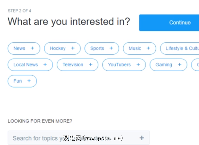 完成后,Twitter会为您提供简短的介绍并询问您感兴趣的内容。您可以单击任何图标以添加兴趣或搜索您感兴趣的主题。这有助于Twitter为您推荐帐户。