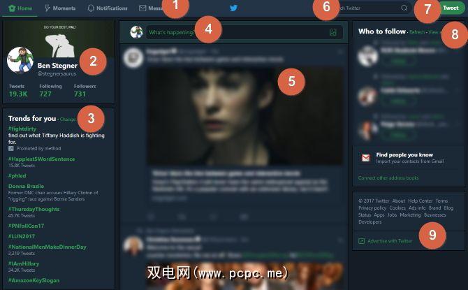 登录后导航到Twitter主页将显示您的时间轴以及其他几个元素。让我们细分一下这些功能的用途: