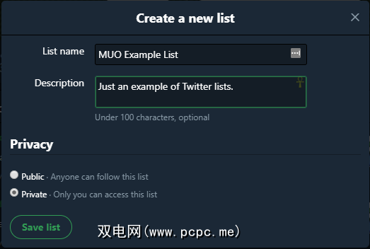 要开始使用列表,请在Twitter页面的右上角单击您的个人资料图片,然后选择列表。在屏幕右侧,点击创建新列表按钮。如果愿意,给它起一个名字和简短的描述。然后,确定您希望列表为公开还是私有。如果是前者,则任何人都可以访问该列表,关注它并查看其成员。完成后,点击保存列表。