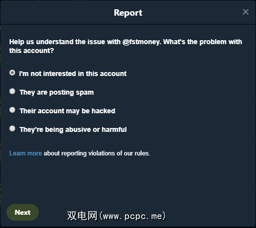 在此菜单中,您也可以报告。您应该报告发布垃圾邮件,被黑或被滥用的帐户。不要报告您根本不喜欢的帐户;报告适用于违反Twitter规则的帐户。除非Twitter的安全委员会决定不喜欢您。