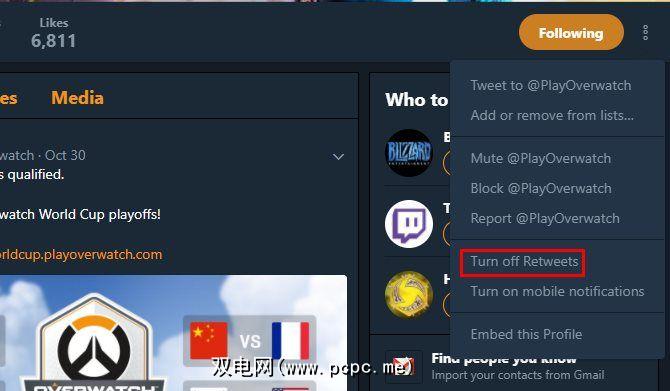 您可能真的很喜欢用户的推文,但发现它们转发的次数过多,或者您不想看到RT内容。要为用户禁用即时出价,请访问其页面,然后点击菜单按钮。选择关闭转推,您将不会在时间轴上看到任何有关用户实时转帐的信息。