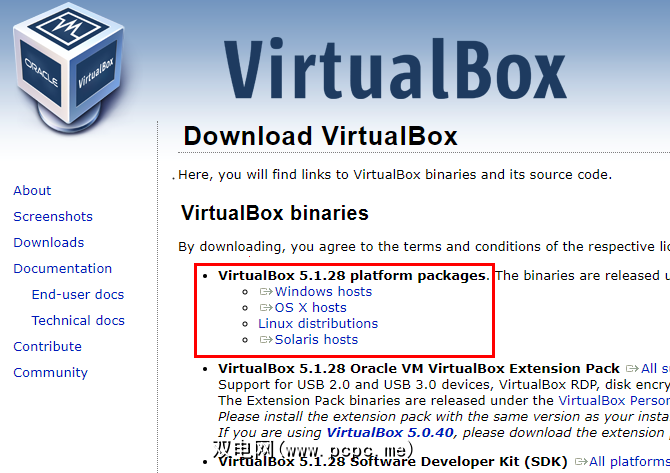 首先,请访问VirtualBox的下载页面。您可以在Windows,macOS和Linux上使用该软件。我们在本教程中使用Windows,但是在所有三个平台上它几乎都是相同的。在 VirtualBox X.X平台软件包下查看并下载适用于您操作系统的副本。