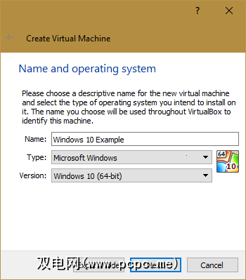 首先单击VirtualBox主页上的蓝色 New 按钮。您需要给您的VM命名。选择一些独特的东西,以便您可以在机器之间进行识别。输入名称后,VirtualBox会自动更改类型和版本字段以匹配您输入的内容。如果不正确,请确保将类型设置为 Microsoft Windows ,将版本设置为 Windows 10(64位)。确认后,单击下一步。