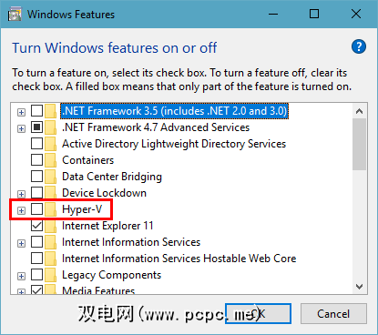 键入 Windows功能 >进入“开始"菜单,然后打开打开或关闭Windows功能选项。在出现的对话框中,向下滚动并确保未选中 Hyper-V 旁边的框。如果是这样,请取消选中该框,单击确定,然后重新启动PC。